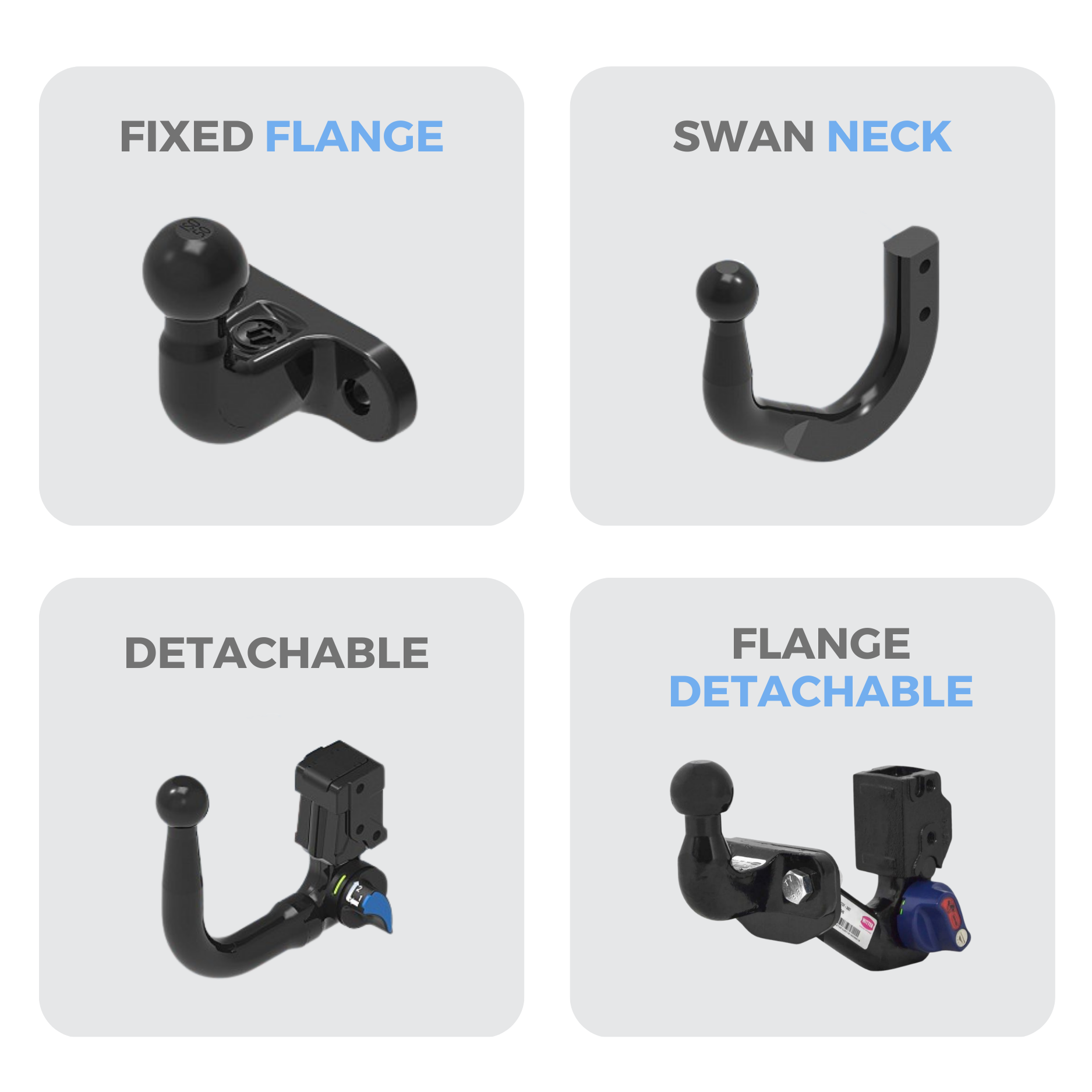 Fixed type tow bars include swan neck and flange. Both of these types stay fastened to the vehicle. And are a permanent fixed position and visible at the rear of the vehicle. This type of tow bar is usually the cheaper option.